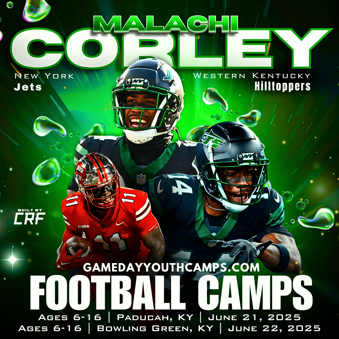 Join New York Jets and WKU All-American Malachi Corley for his football camp. Malachi and his staff will teach your player drills, speed and agility, and participants will receive a limited edition “camp specific” t-shirt. “